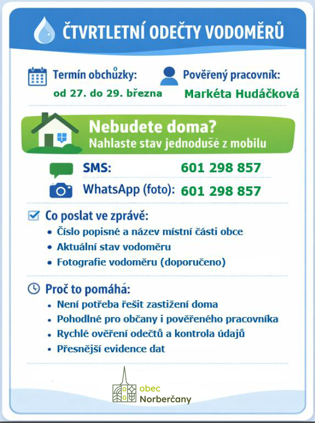 V termínu od 27. do 29. března 2026 proběhnou čtvrtletní odečty vodoměrů. Pověřený pracovník navštíví jednotlivé domácnosti. Pokud nebudete doma, můžete jednoduše nahlásit stav vodoměru prostřednictvím SMS nebo WhatsApp. Stačí zaslat číslo popisné, název místní části a aktuální stav vodoměru, ideálně s přiloženou fotografií. Tento postup umožní rychlé ověření odečtů a zjednoduší práci jak občanům, tak pověřenému pracovníkovi.