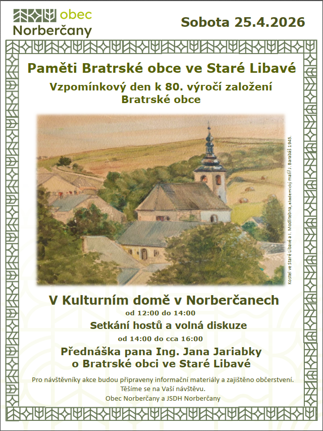 V sobotu 25. dubna 2026 se v Kulturním domě v Norberčanech uskuteční vzpomínkový den k 80. výročí založení Bratrské obce ve Staré Libavé.