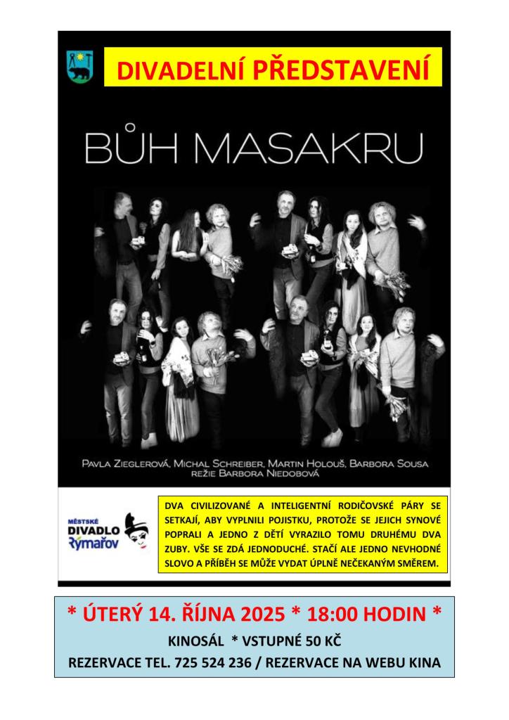 Přijďte se podívat na napínavé divadelní představení, které se zaměřuje na nečekané situace v rodičovství. Dva rodiče se setkávají, aby vyřešili konflikt mezi svými syny, který skončil vážným zraněním. Jak jedno nevhodné slovo může změnit celou situaci? Tato inscenace nabízí nejen humor, ale také hluboké zamyšlení nad mezilidskými vztahy a komunikací. Nenechte si ujít tuto zajímavou podívanou, která se odehraje v kině v Moravském Berouně a představí nám ji Městské divadlo Rýmařov.