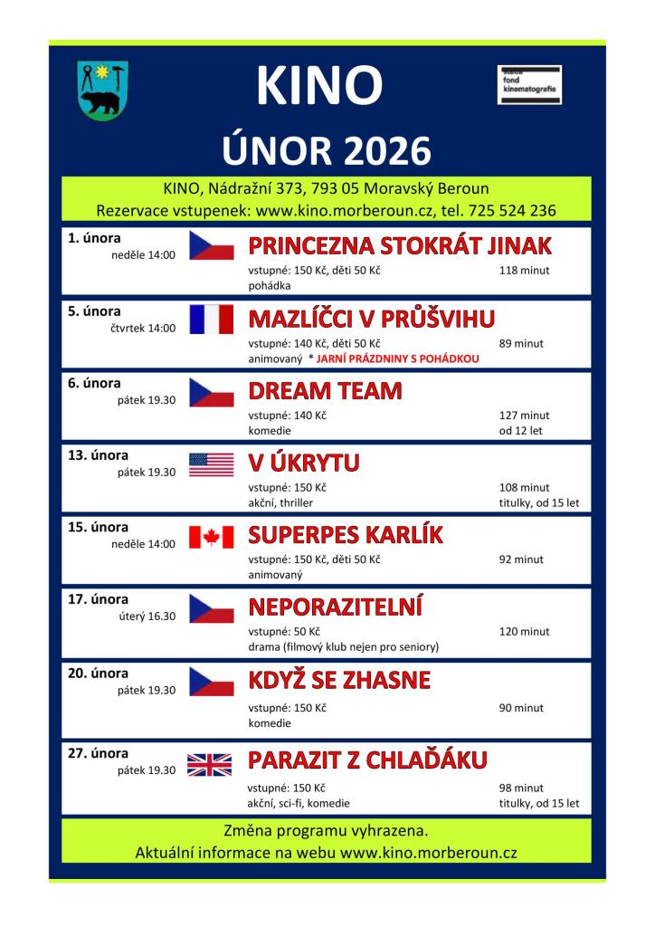 V únoru 2026 probíhá v kině na Nádražní 373 v Moravském Berouně pestrý program filmových projekcí. Na výběr jsou pohádky, animované filmy, komedie, akční snímky a drama. Každý týden si můžete užít jiný film, a to v různých časech, včetně víkendových víkendových projekcí. Vstupné se pohybuje od 50 Kč do 150 Kč, podle typu filmu, a pro mladé lidi jsou připraveny zvýhodněné ceny. Pro aktuální informace navštivte webové stránky kina.
