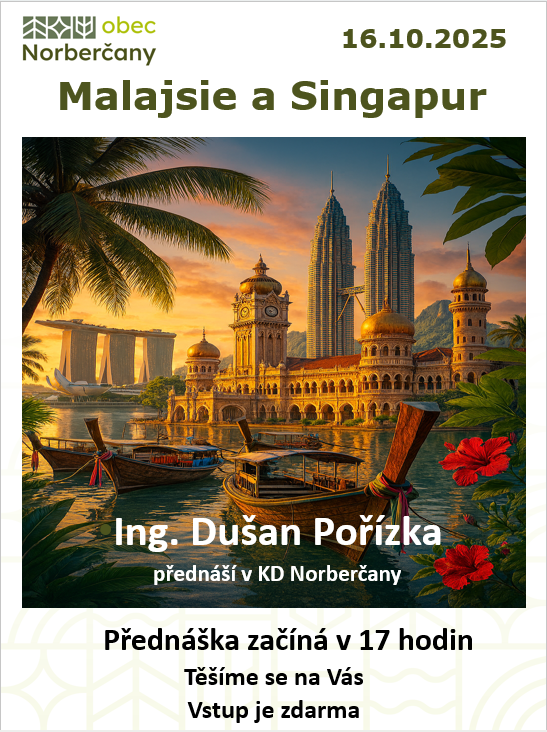 Zveme vás na zajímavou přednášku o Malajsii a Singapuru, kterou povede Ing. Dušan Pořízka. Přednáška se uskuteční 16. října 2025 v Kulturním domě Norberčany a začíná v 17:00. Přijďte se dozvědět více o těchto fascinujících destinacích, které osobně pan Pořízka tohoto roku navštívil. Těšíme se na vaši účast.