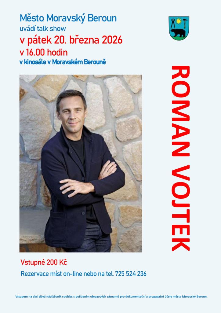 Město Moravský Beroun zve všechny zájemce na talk show s Romanem Vojtkem, která se uskuteční v pátek 20. března 2026 v 16:00 hodin. Akce se bude konat v kinosále v Moravském Berouně. Vstupné na tuto akci činí 200 Kč. Rezervace míst je možná on-line nebo telefonicky na čísle 725 524 236. Vstupem na akci dává návštěvník souhlas s pořízením obrazových záznamů pro dokumentační a propagační účely města Moravský Beroun.